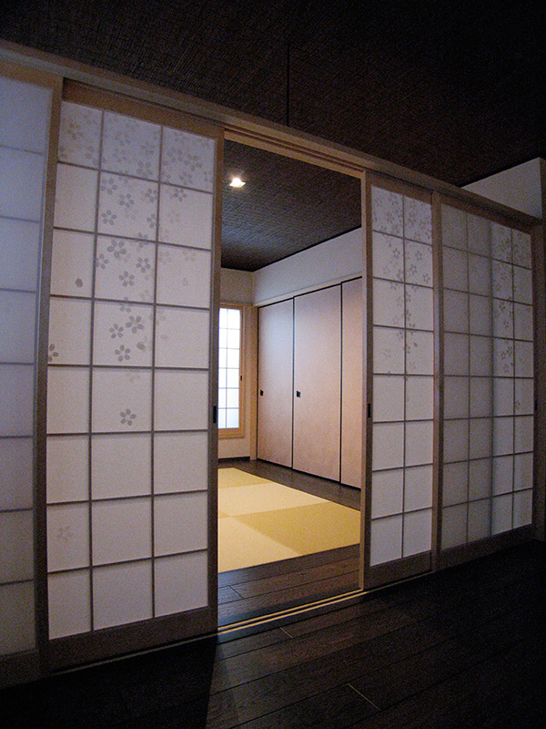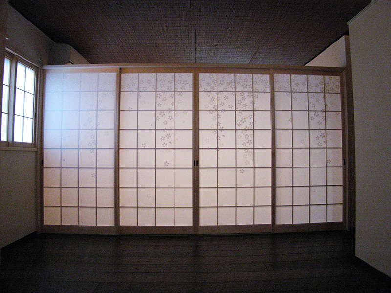 フィルムが挟み込まれた障子紙に、華やかな桜の花が舞う「爛漫」の柄を配しました。